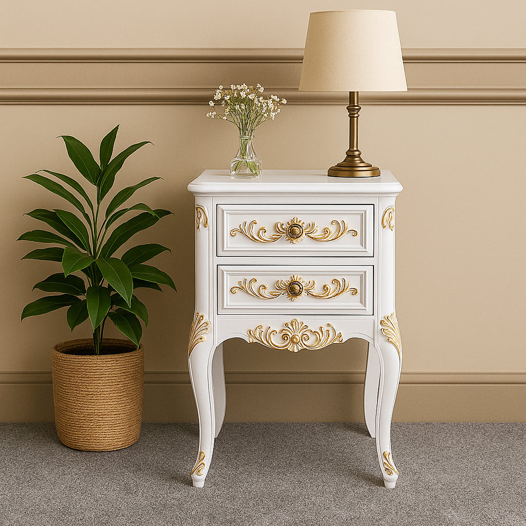 Add a touch of opulence to your home with this Rococo-inspired French side table, exquisitely handcrafted from solid hardwood for lasting beauty and durability. Finished in a crisp white with ornate gold highlights, it features intricate carved detailing, elegant cabriole legs, and antique brass-style handles. Compact yet full of character, this versatile piece works beautifully as a bedside table in a refined bedroom, a side table in a sophisticated living room, or even an accent piece in an elegant hallway. Its two drawers provide practical storage for everyday essentials, while its timeless design enhances any French style interior. A true statement in craftsmanship and style, this table brings the grace of classic French furniture into your home.